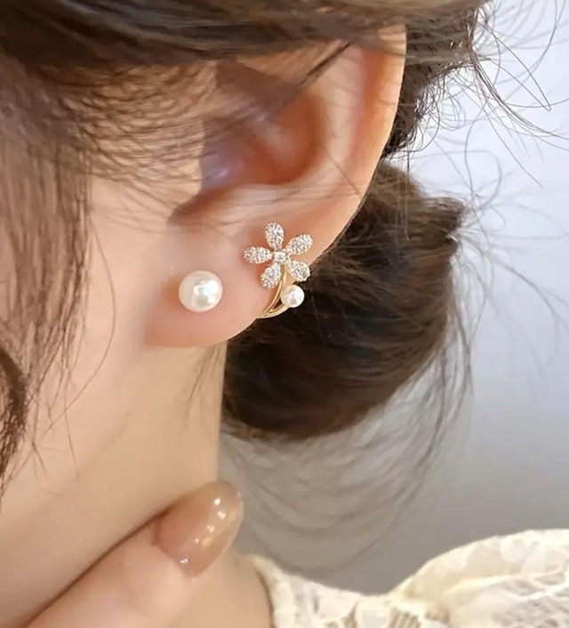 このエレガントなピアスは上品なパールと美しいお花が絶妙に調和したデザインです。 パールのピアスとお花を繋げたスタイルですが取り外しができる2way式です。 お花を取り外してパールだけでお使いいただけます。 お花には輝くビジューが華やかさをプラスし、あらゆるシーンでお楽しみいただけるアクセサリーです。 パール 約8、3mm お花 約15mm ピアス スタッド式、2way式 モチーフ/形...花/植物 モチーフ素材...パール カラー...ゴールド ピアス 形...キャッチ・スタッド