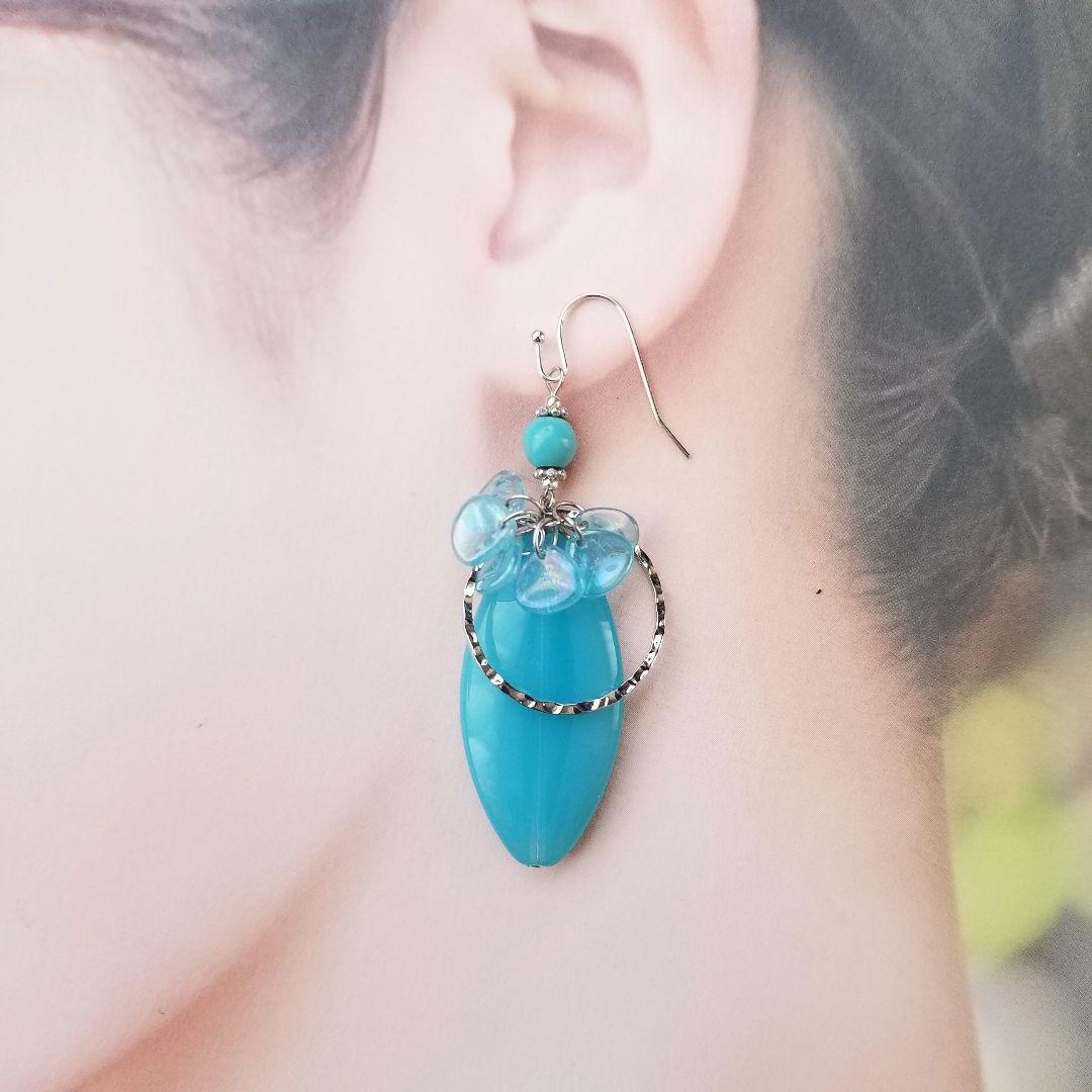 チェコビーズ特有の美しいカットと、ナチュラルな風合いを持つターコイズの組み合わせが、耳元で涼やかに揺れ動きます。