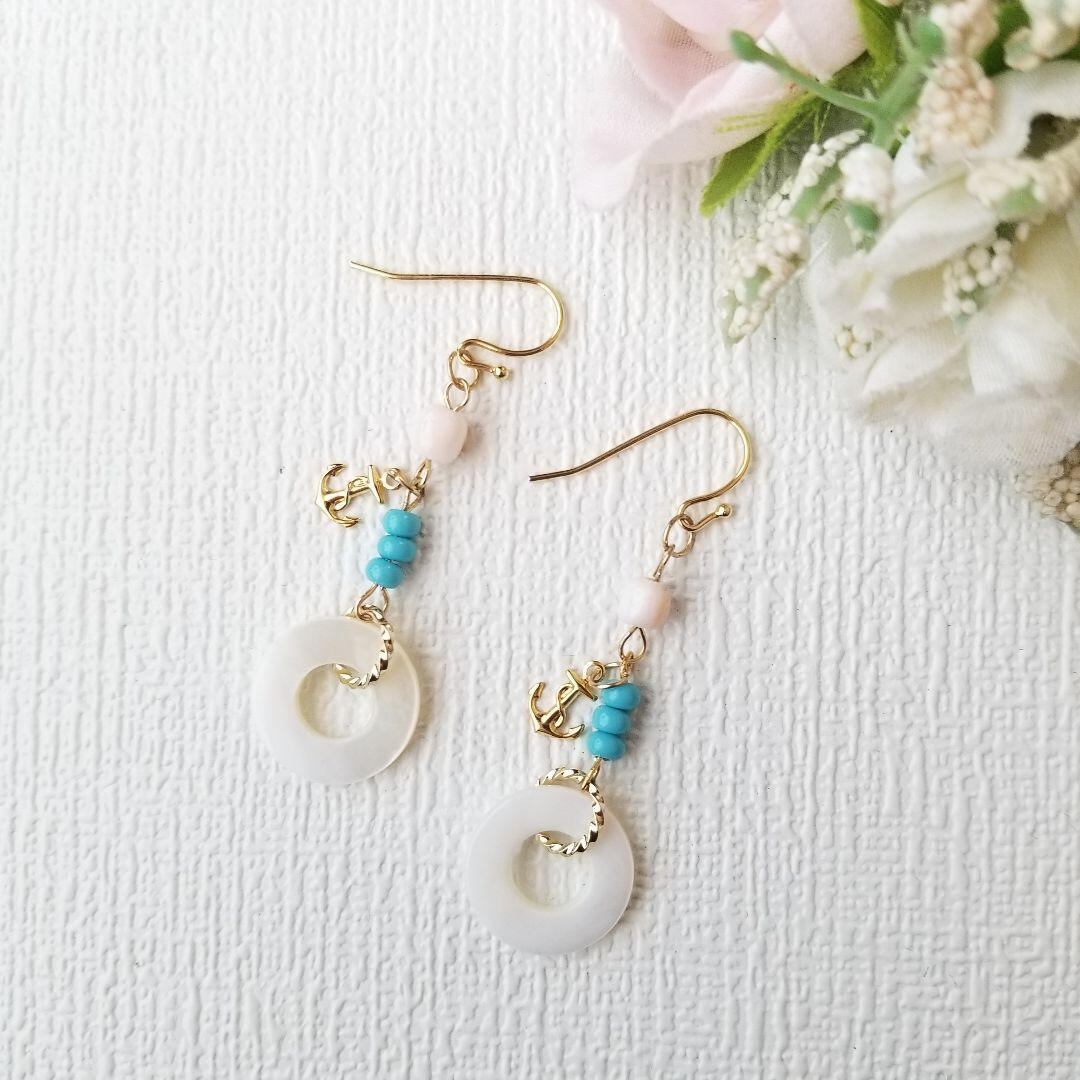 ゴールドカラーのリングに、ドーナツ型のシェルビーズを揺れるように繋げ、下にはゴールドのいかり(アンカー)モチーフをあしらいました。