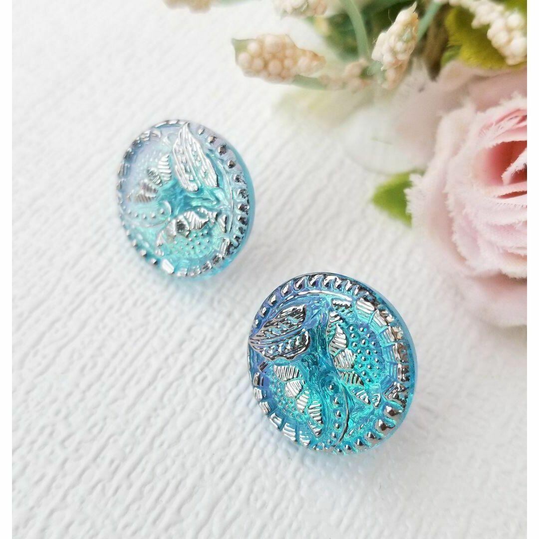 青いチェコガラスボタンを使った、爽やかな印象のピアスです。