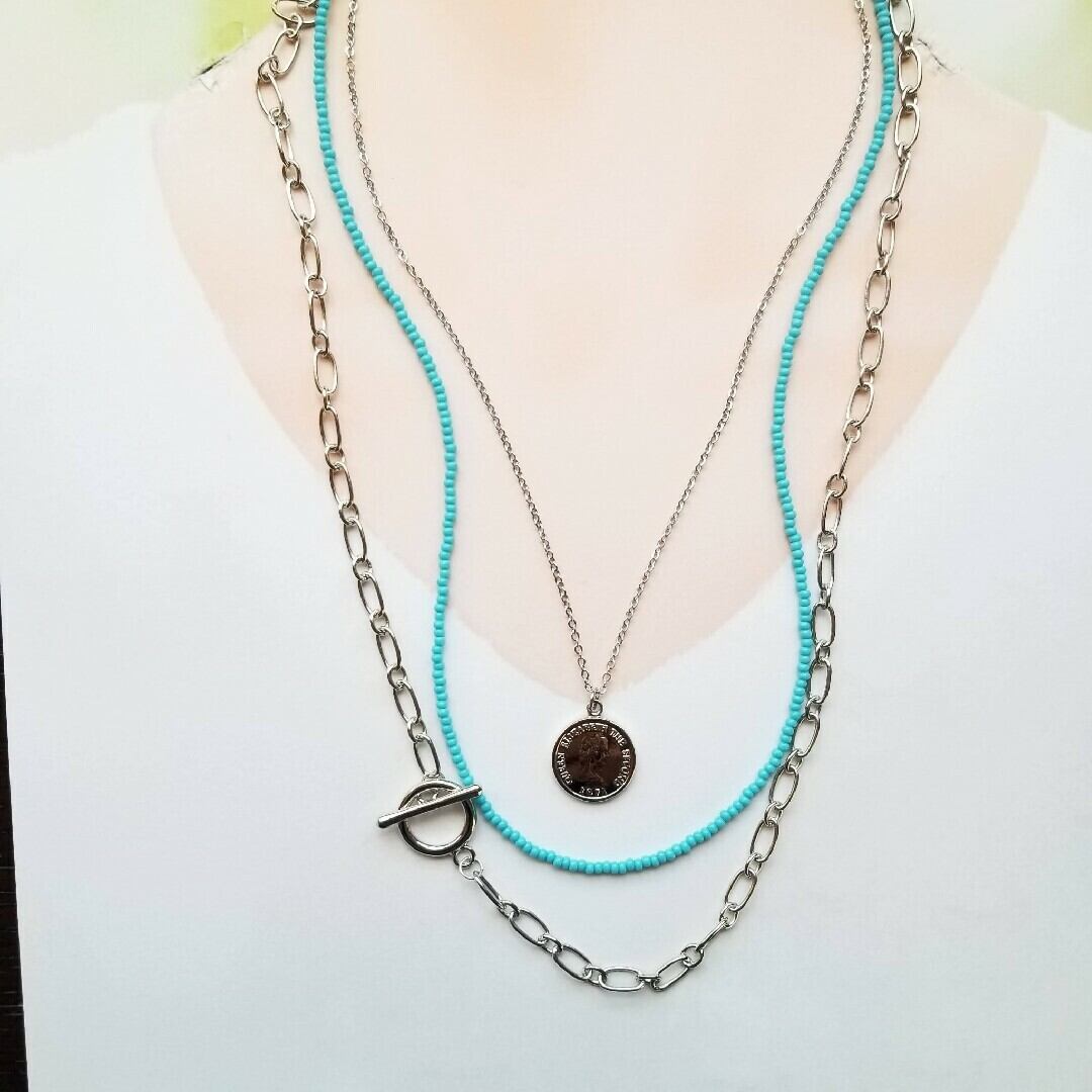 重ね付け3本セット ターコイズブルー&コイン&リングネックレス