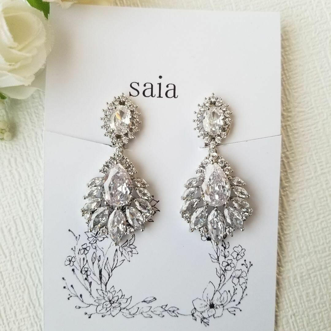 中央のドロップ型ビジューを囲むように、小粒のリーフカットのストーンが放射状に配置されており、動くたびにキラキラと繊細な輝きを放ちます。