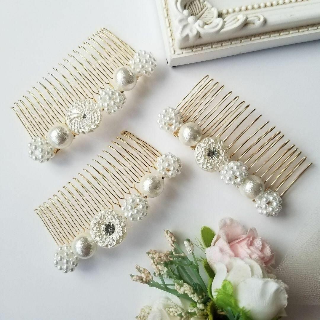 美しい輝きを放つチェコガラスボタンを主役に、パールを贅沢にあしらった華やかなヘアコームです。