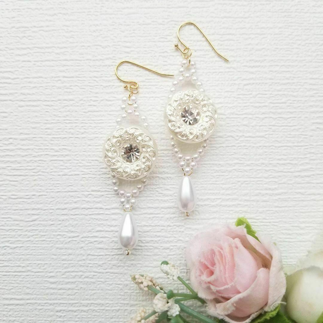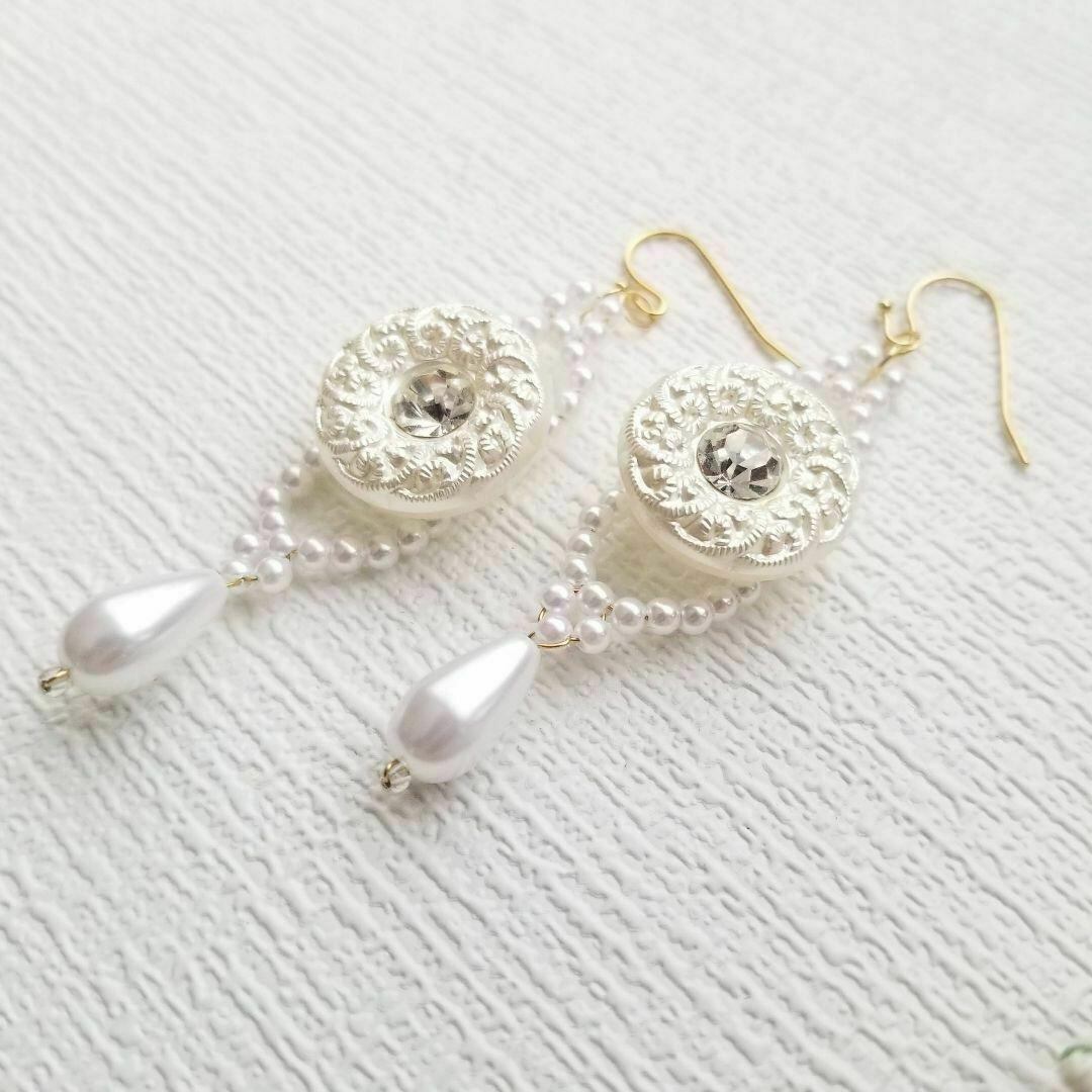 美しい輝きを放つチェコガラスボタンを使用した、繊細で華やかな印象のピアスです。