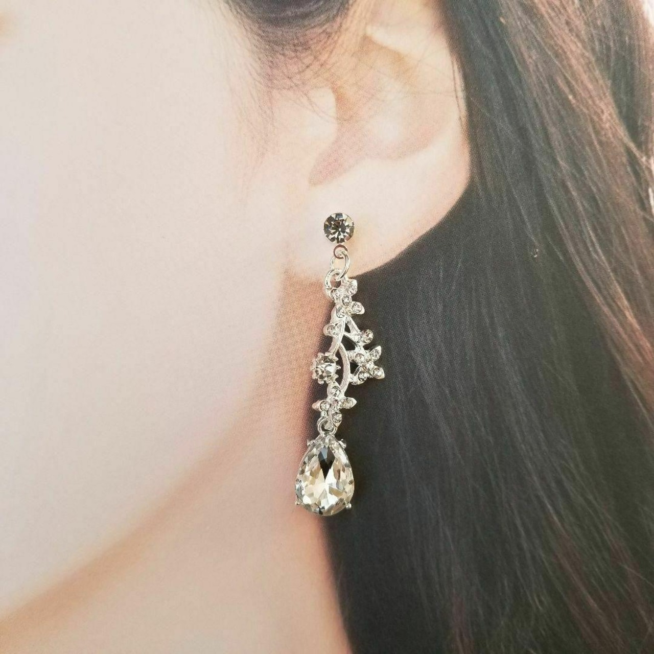 耳元にも揺れるしずく型ビジューと花のモチーフが煌めき、ドレスアップをさらに美しく引き立てます。