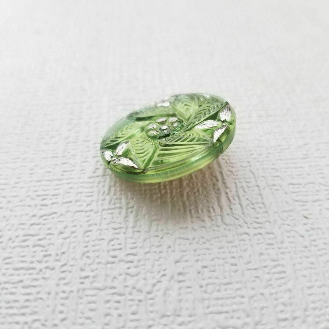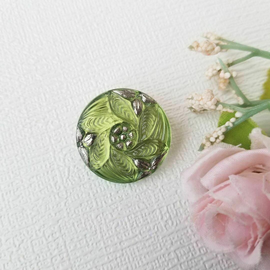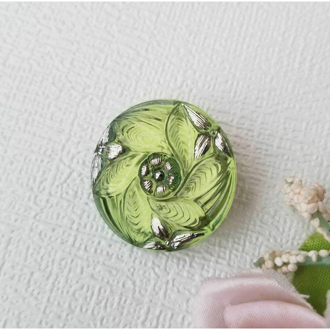 透明感のあるグリーンに、お花のようなデザインが施されたチェコガラスボタンです。