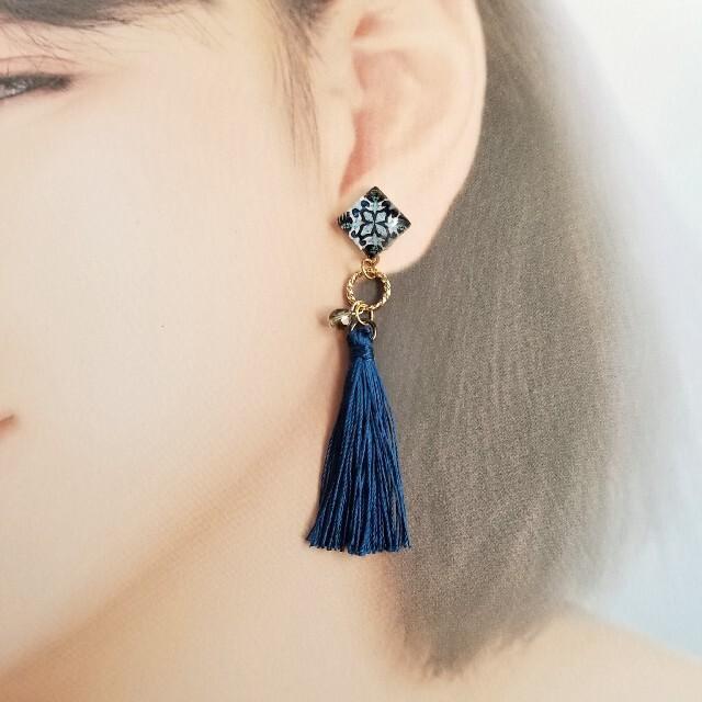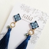 モロッコ柄タイル×シルクタッセルのピアス ネイビーブル・全5色 p436