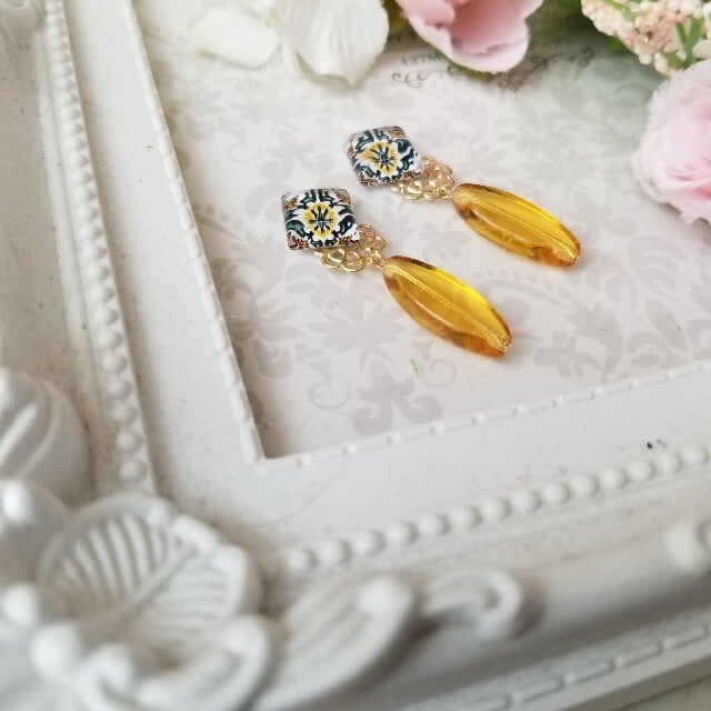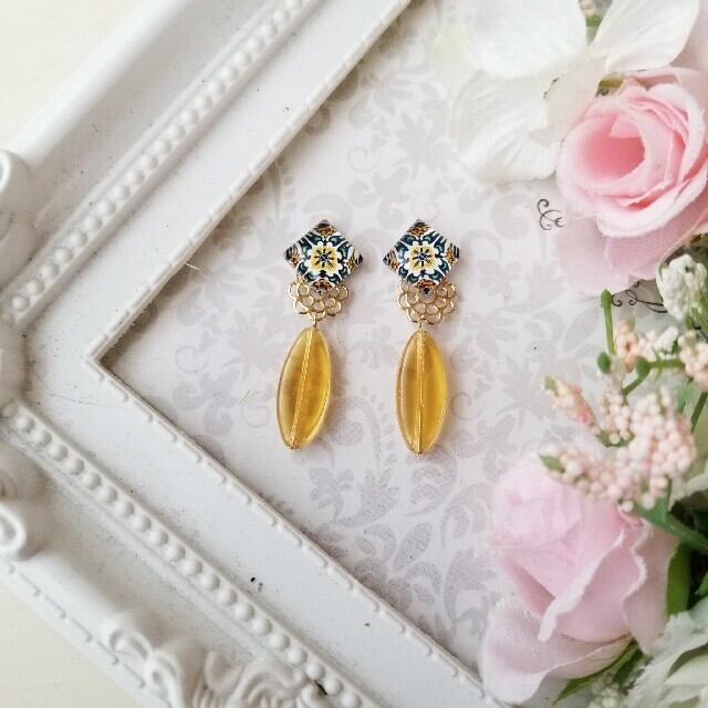 モロッコタイルに合わせた黄色のチェコビーズが地中海の太陽を思わせるような異国情緒溢れるピアスです。