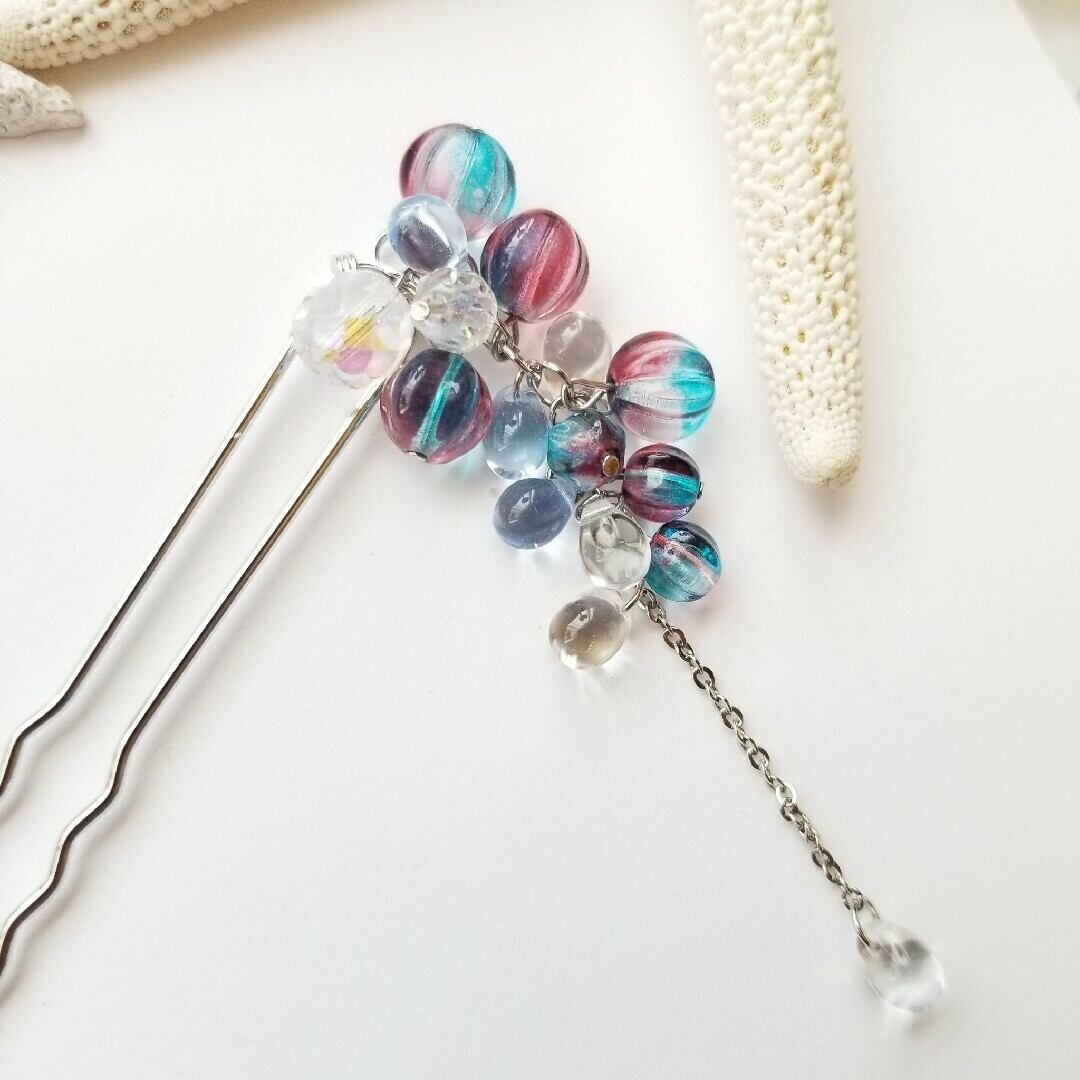 透明感あふれるブルー系のチェコビーズをたっぷり使用し、赤と青色合いが水風船のような可愛らしい印象のかんざしです。