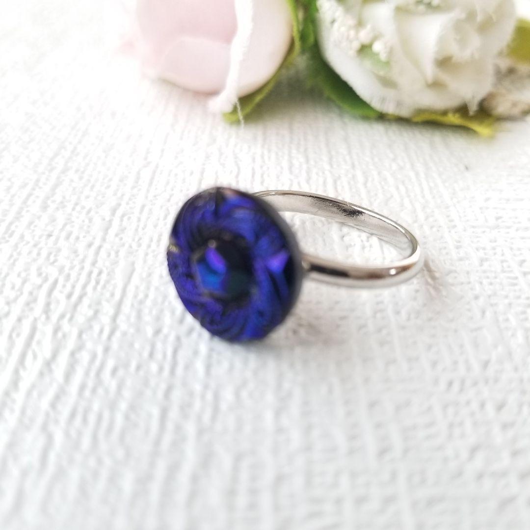 深みのあるロイヤルブルーが印象的な、チェコガラスボタンを使ったリングとネックレス。