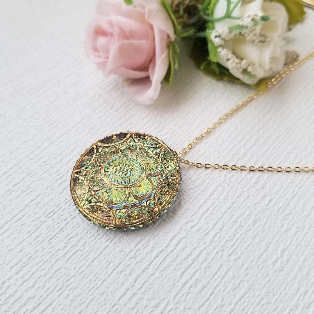 チェコガラスボタンのネックレス〈レース模様・上品な輝き〉32mm ckn1406