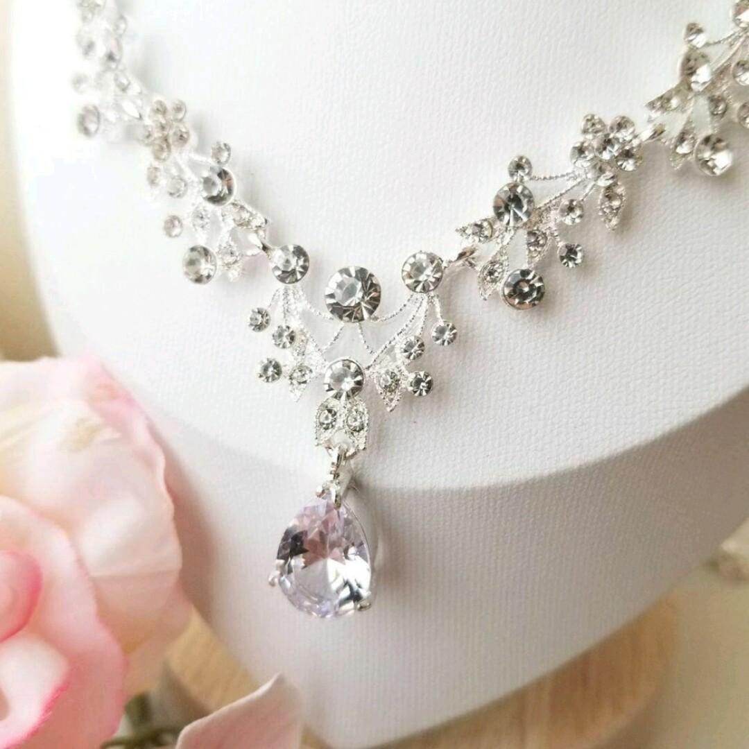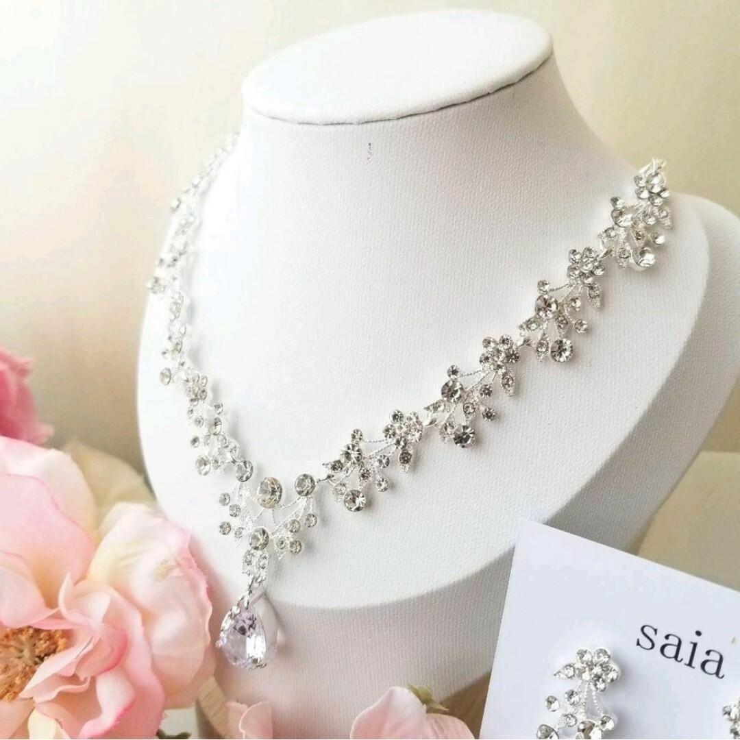 透明感のあるクリスタルが花のように連なり、胸元には大粒のしずく型ビジューが揺れるデザイン。