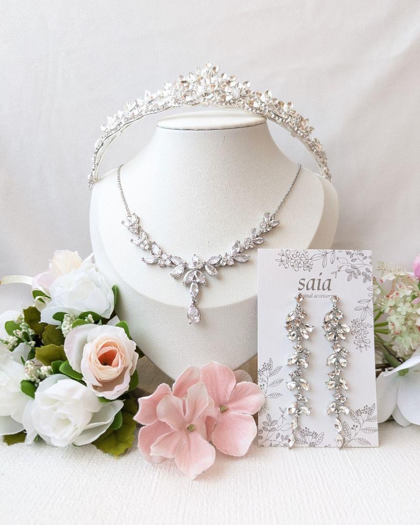 リーフモチーフをふんだんに使った華やかなティアラと、大粒ストーンが輝くネックレス&ピアスのブライダルセット。
