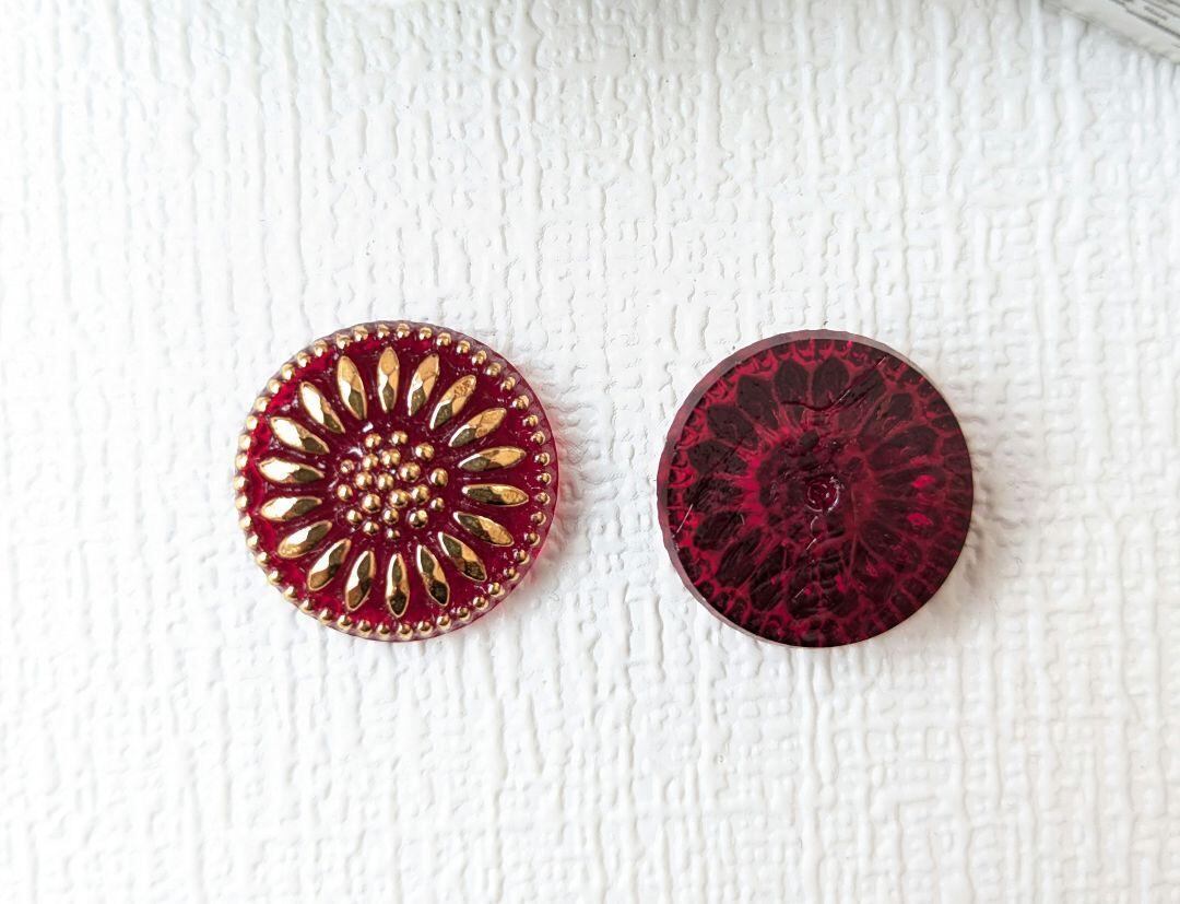 透明感のある深紅に、ゴールドの模様が映えるチェコガラスボタンです。