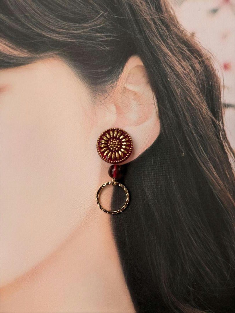 深紅のチェコガラスボタンの2wayピアス/チェコビーズ×ゴールドリング