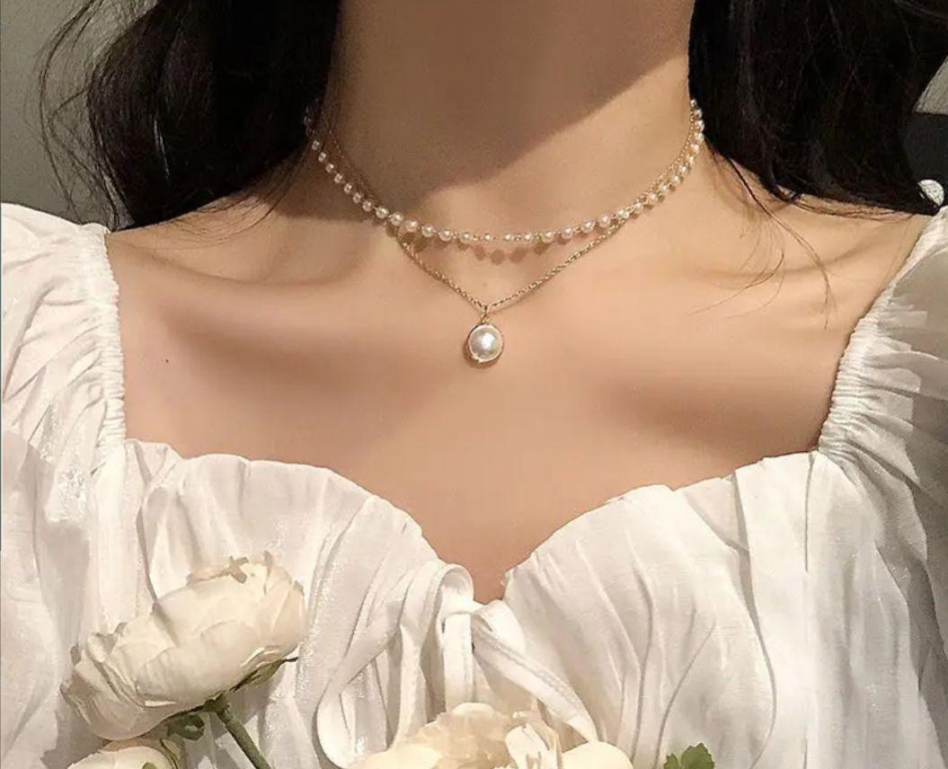 上品な輝きを放つ小粒パールと、一粒パールチャームを組み合わせた2連ネックレスです。