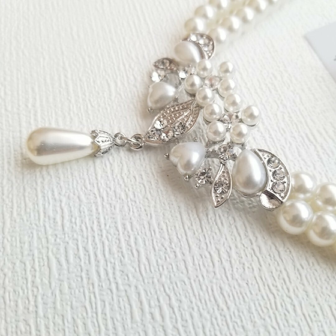 2連のパールラインがデコルテを華やかに彩り、中央にはビジューとティアドロップパールを組み合わせた高級感のあるデザイン。