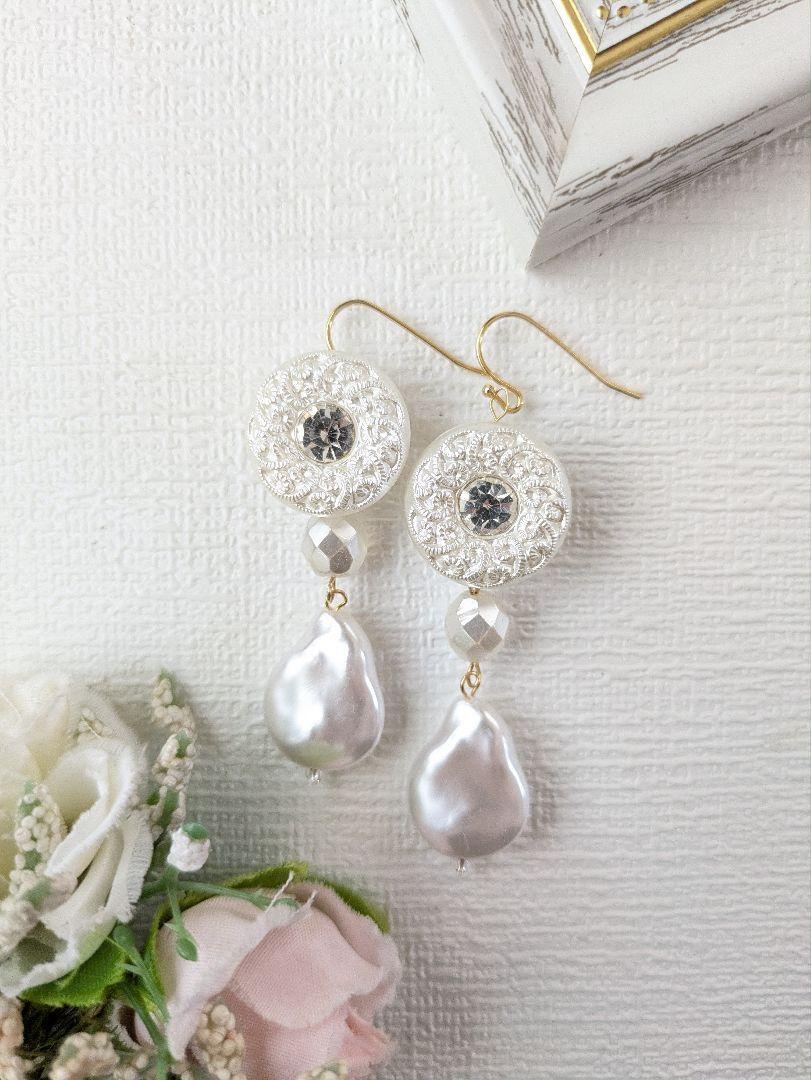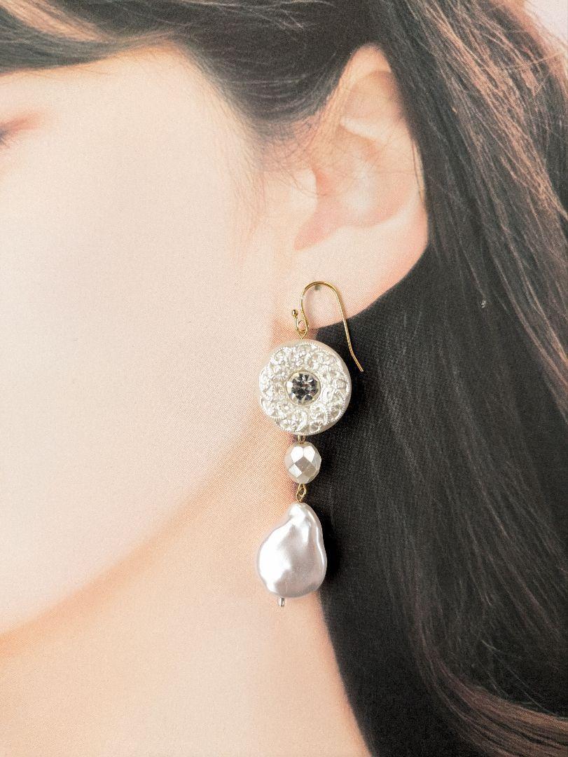 耳元でゆらゆらと揺れるバロックパールが女性らしさを引き立て、