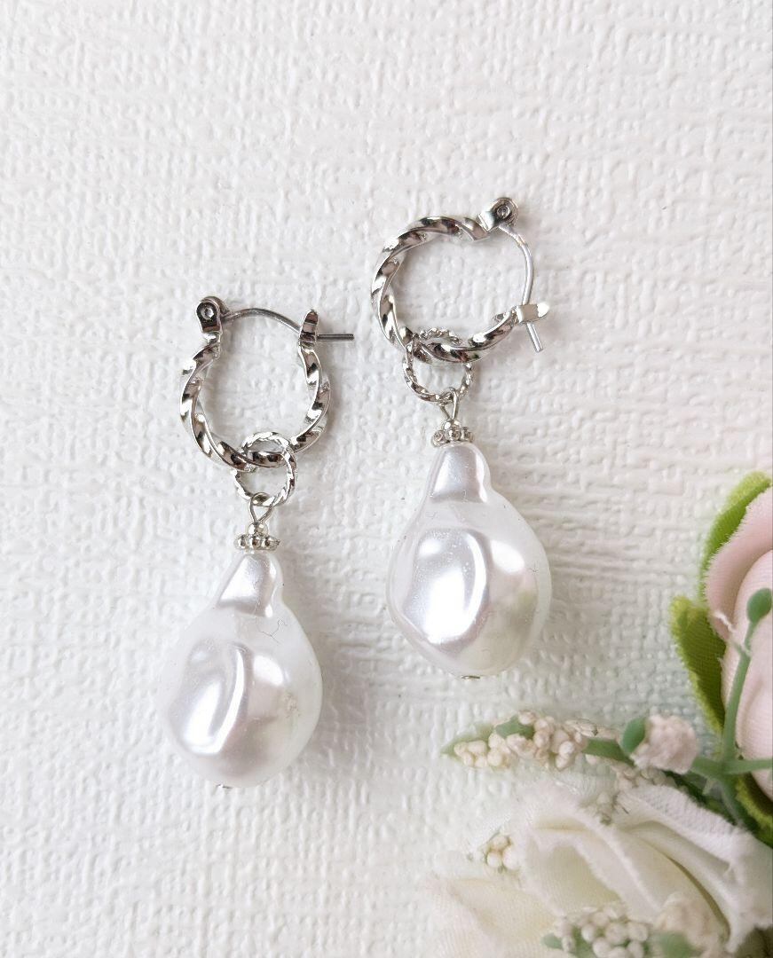 しずくのように輝く**ドロップ形のバロックパール(樹脂)**を使用した2wayピアスです。