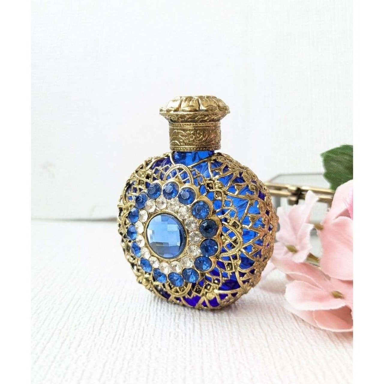 深みのあるロイヤルブルーのガラスに、繊細なゴールドのフィリグリー装飾とチェコガラスストーンを贅沢に施した香水瓶です。