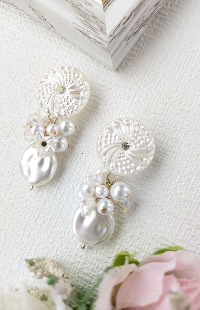 上品な輝きを放つチェコガラスボタンに、パールやお花のビーズを合わせた華やかなピアスです。
