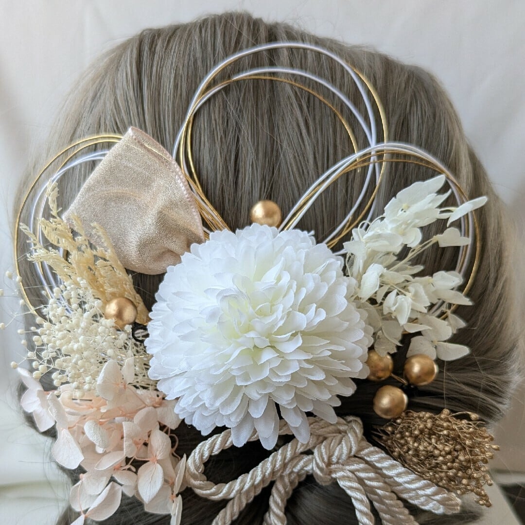 大輪の花と可憐な小花、水引き、組紐飾りや葉パーツを組み合わせ、360度どこから見ても美しい仕上がりに。