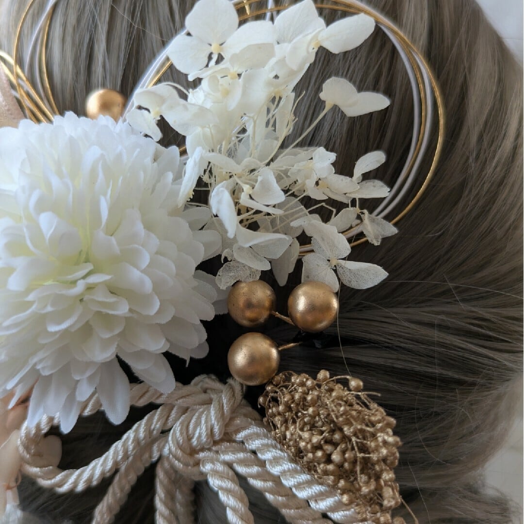 【内容詳細】あじさい、かすみ草、和玉、リボン、スケルトンリーフ、ポリエステルフラワー、組紐リボン、金箔シート