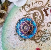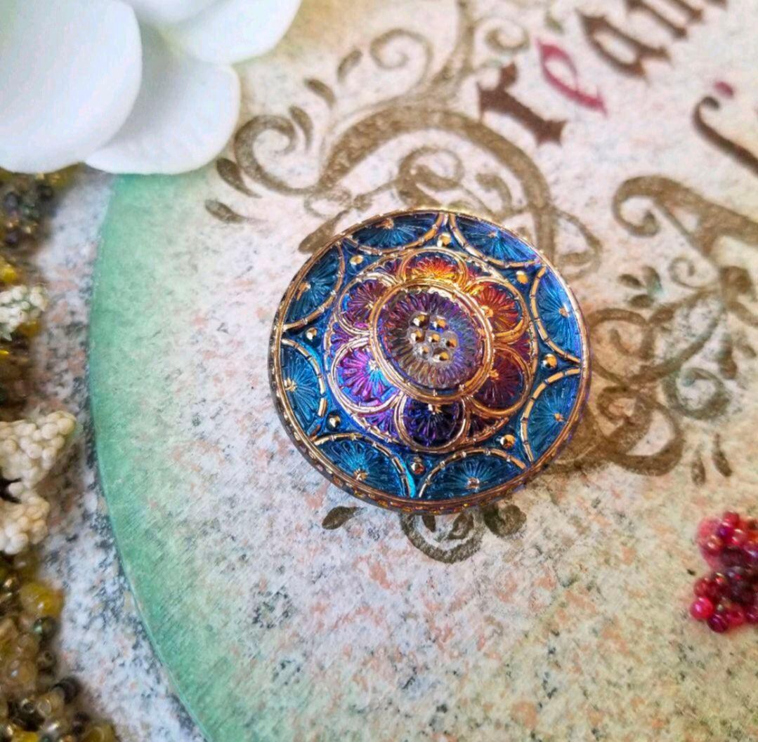 【再入荷】青×ゴールド アンティーク調チェコガラスボタンのポニーフック/帯留め