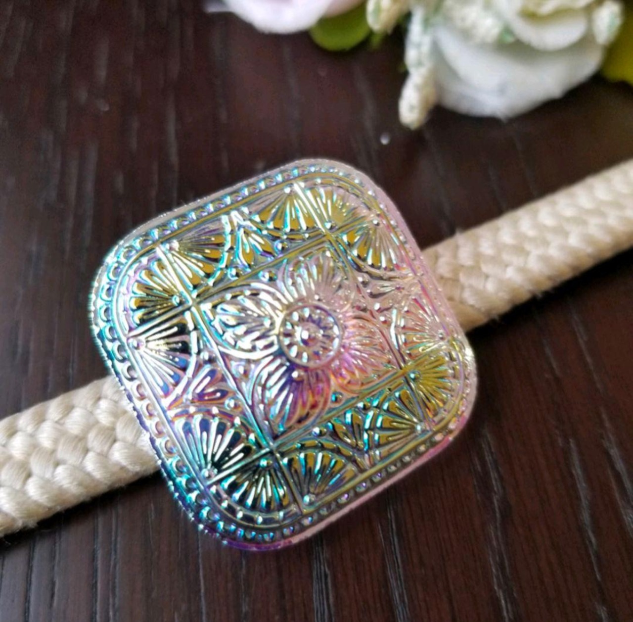 スクエア型のフォルムが印象的な、オーロラカラーのチェコガラスボタン。