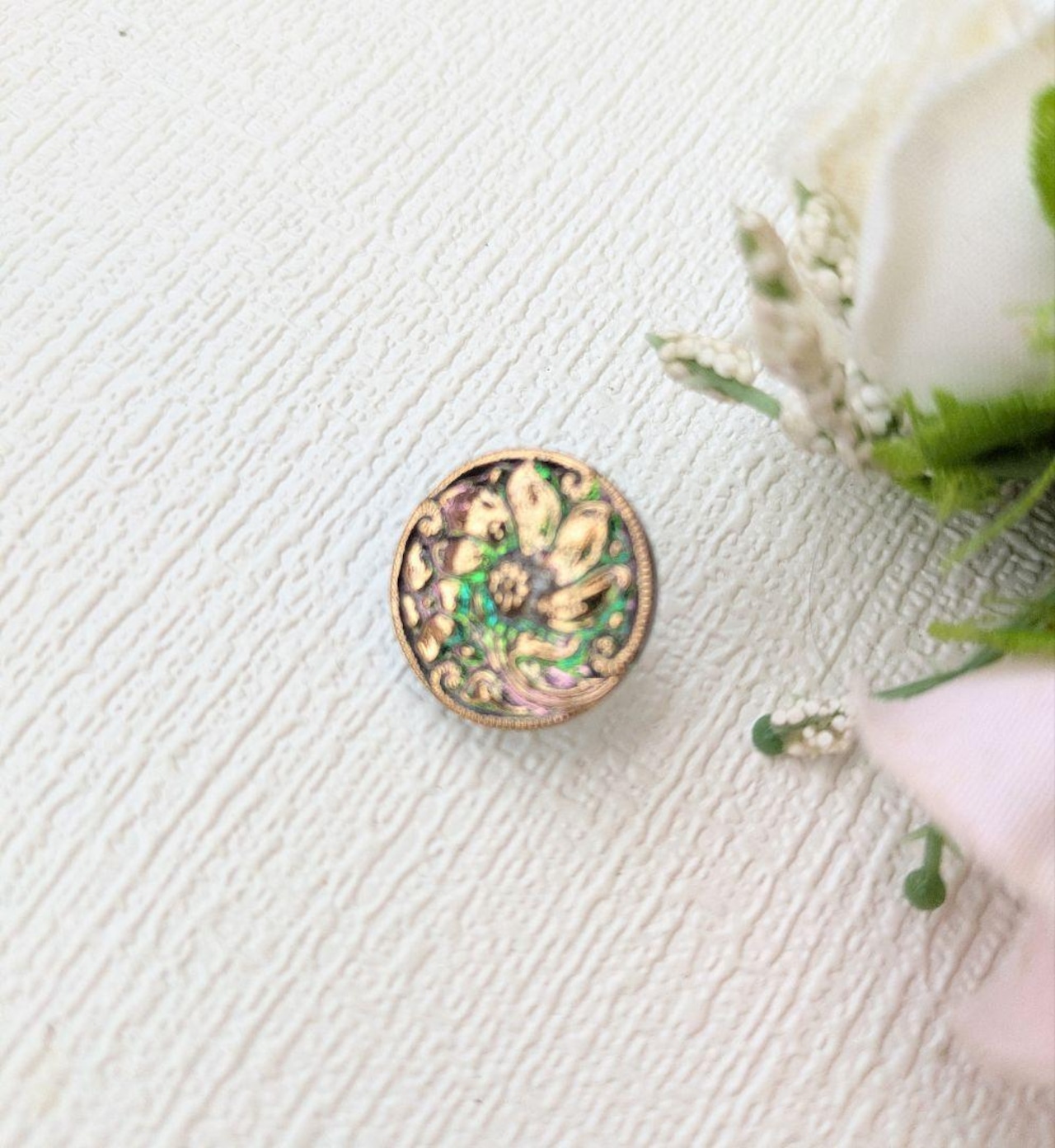 アンティークゴールドと深みのあるグリーンが美しく重なった、存在感のあるボタンです。