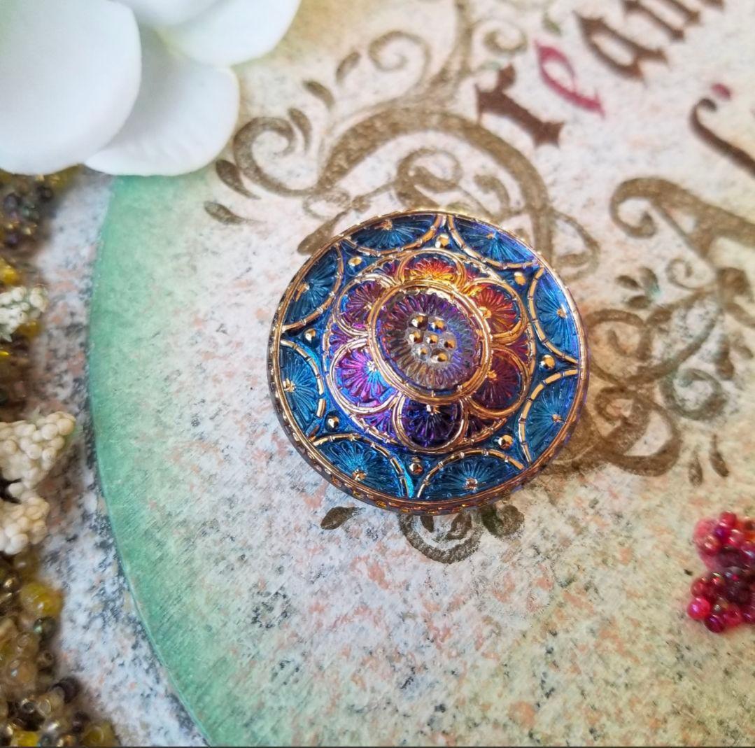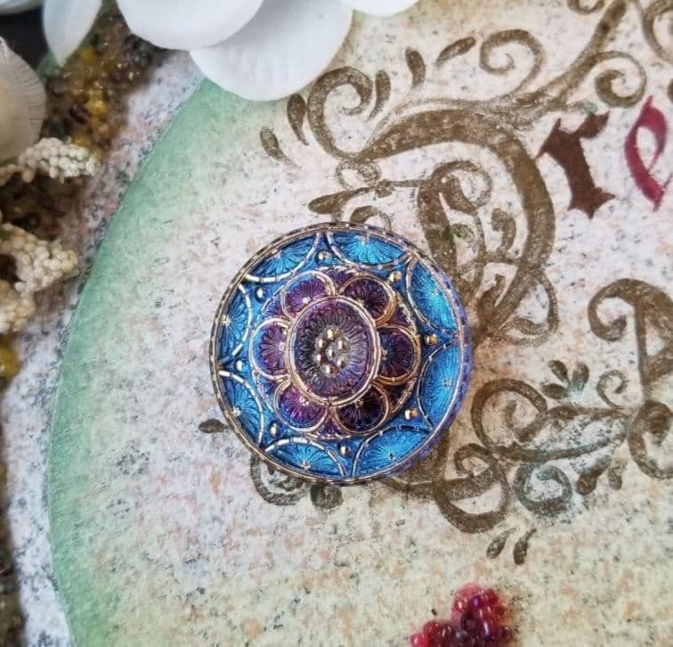 チェコガラスボタン 帯留め ポニーフック 金具付き|ブルー×パープル 花模様