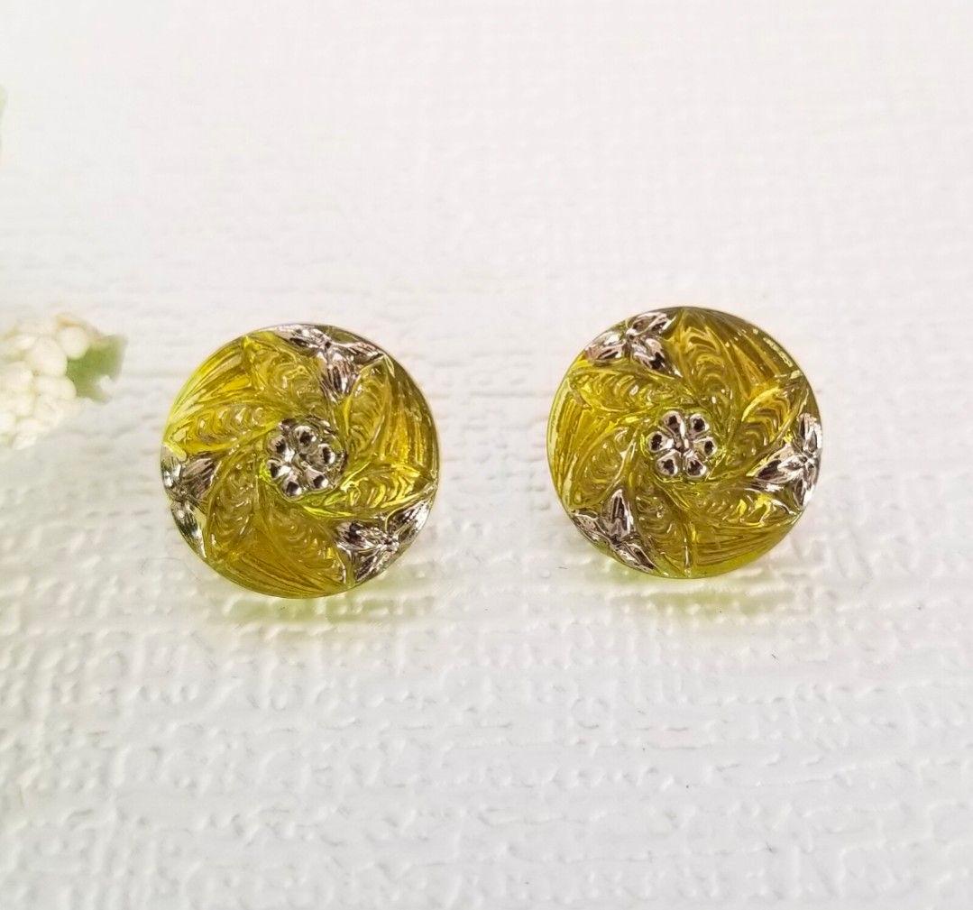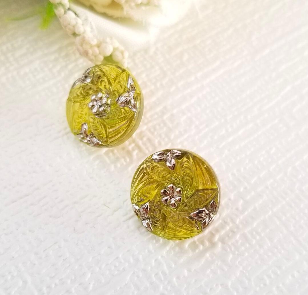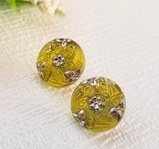 チェコガラスボタン ピアス 15mm|オリーブグリーン 花模様|ヴィンテージ風