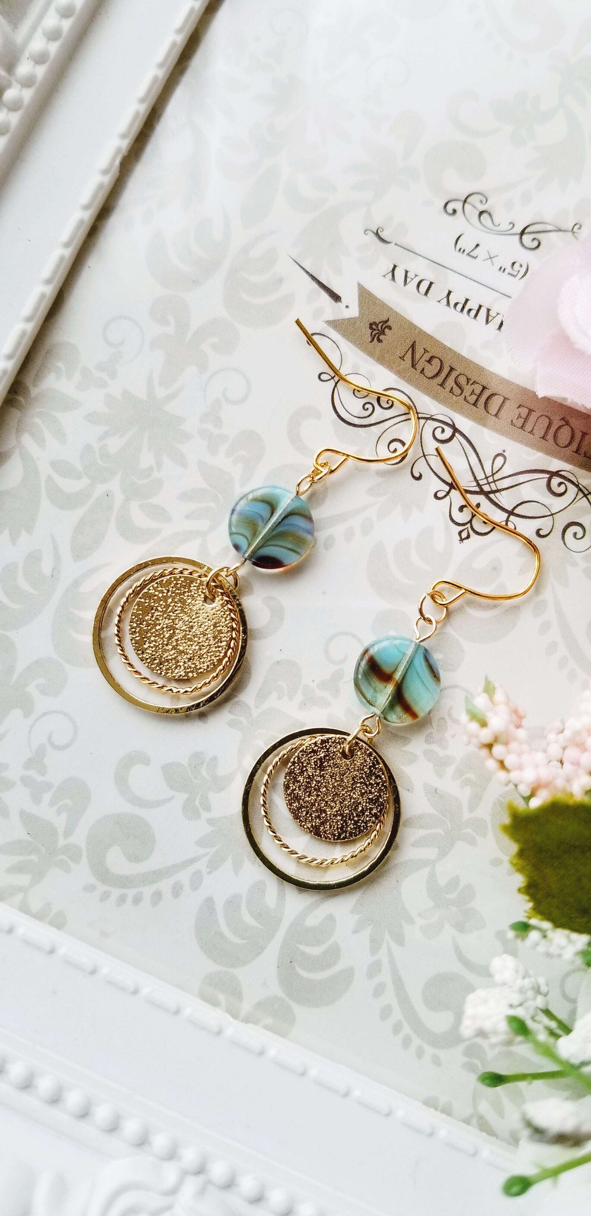 海の色を思わせるような色合いがとても綺麗なチェコビーズと大きさの違うゴールドの金具を合わせてスタイリッシュなピアスてす。