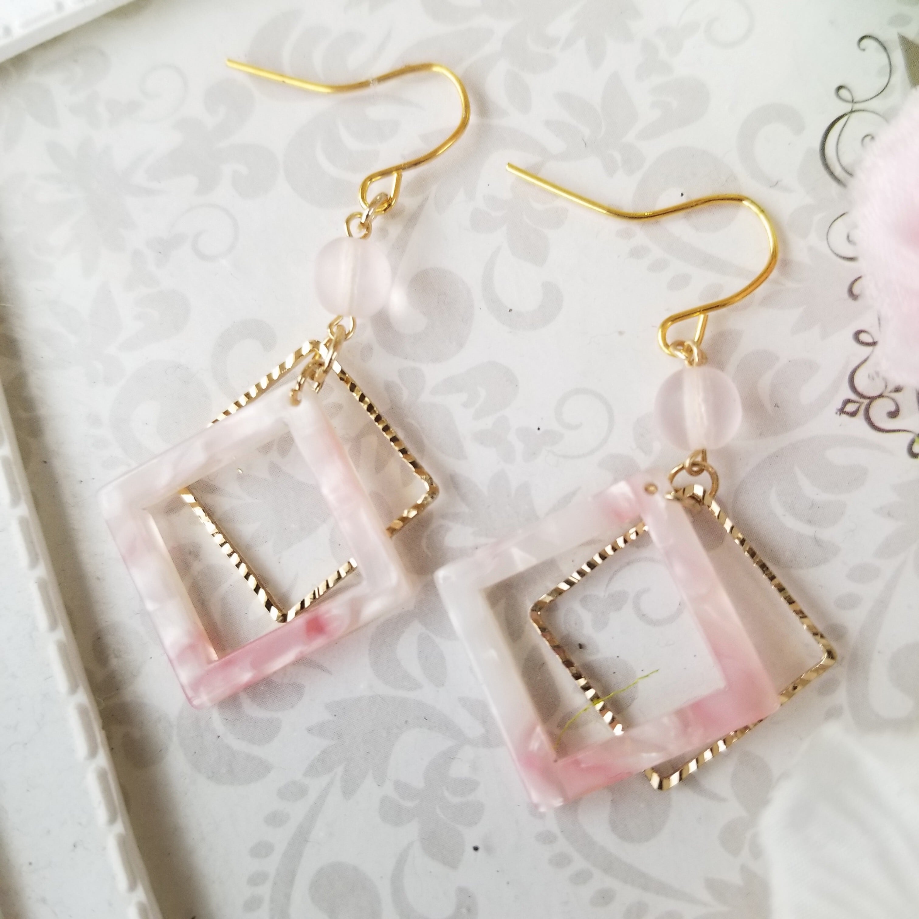 桜色の四角いフレームが春らしい可愛い色合いのピアスです。ゴールドのフレームが華やかで春先の装いによく似合います。