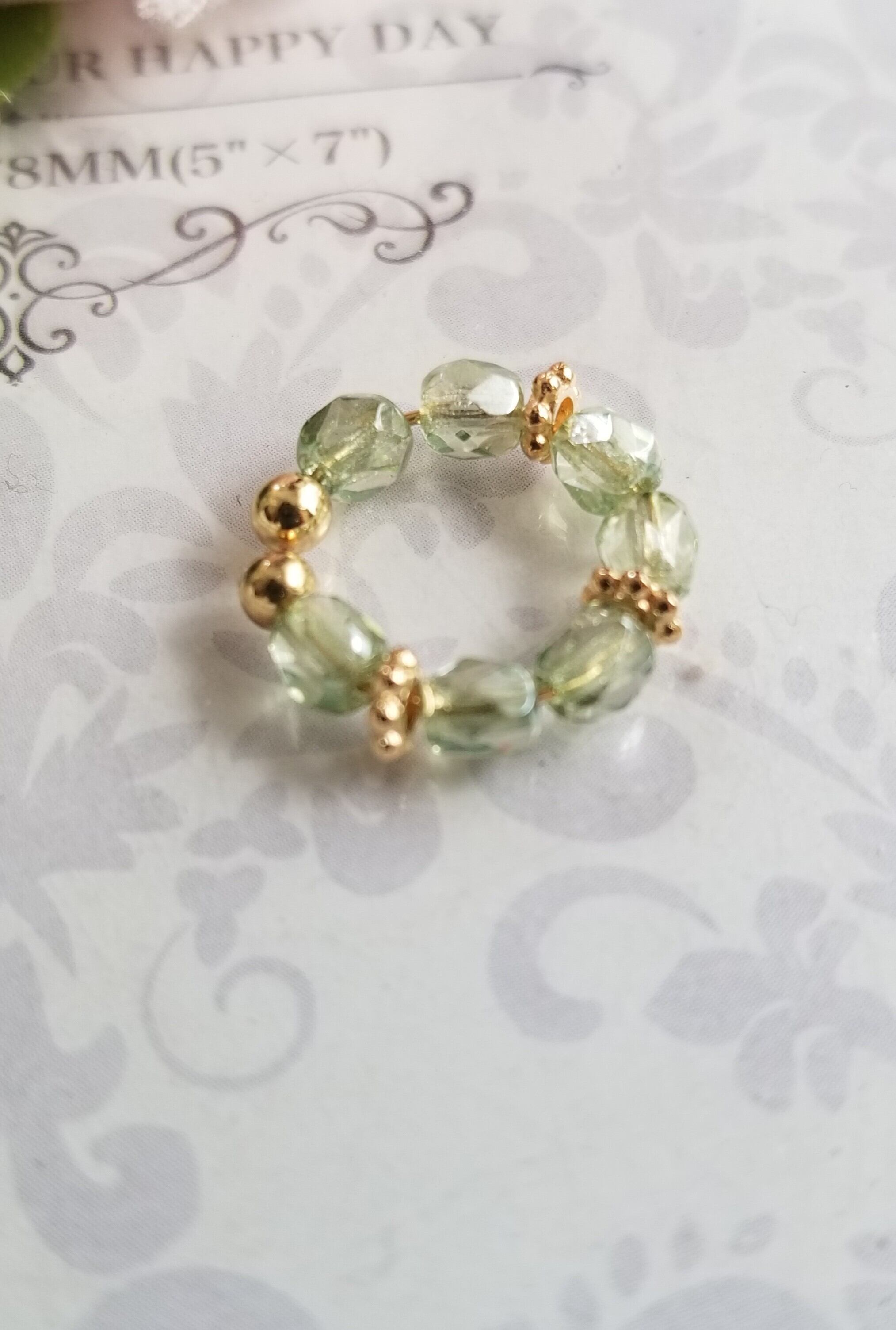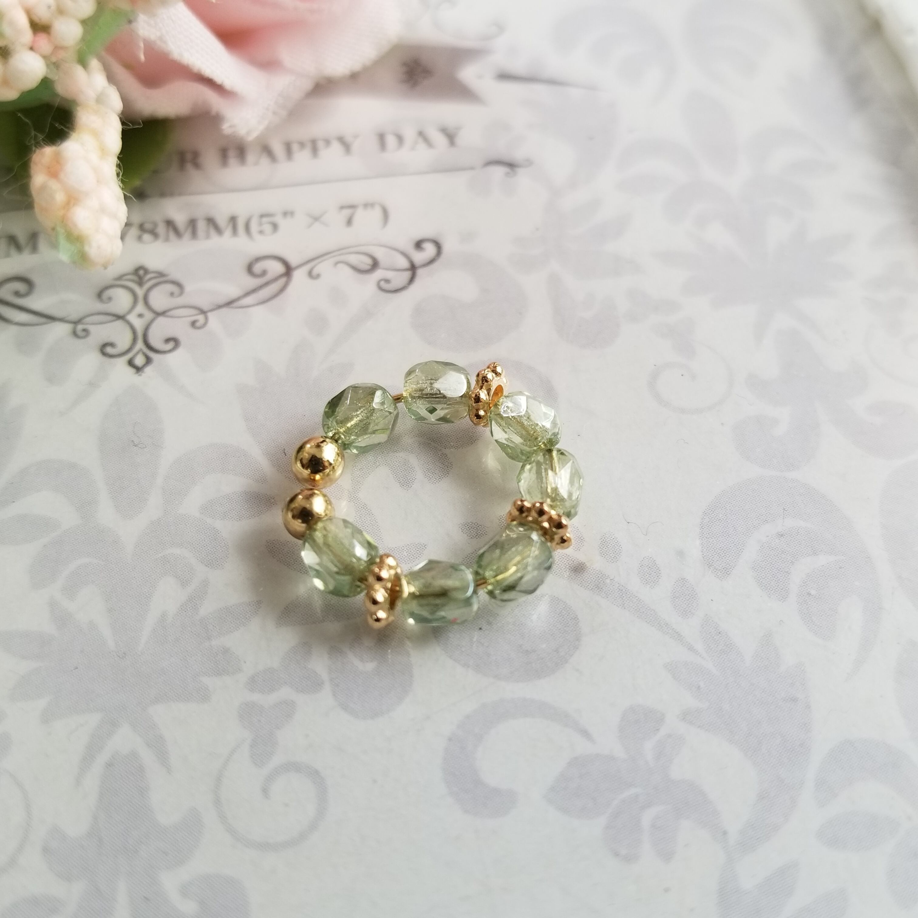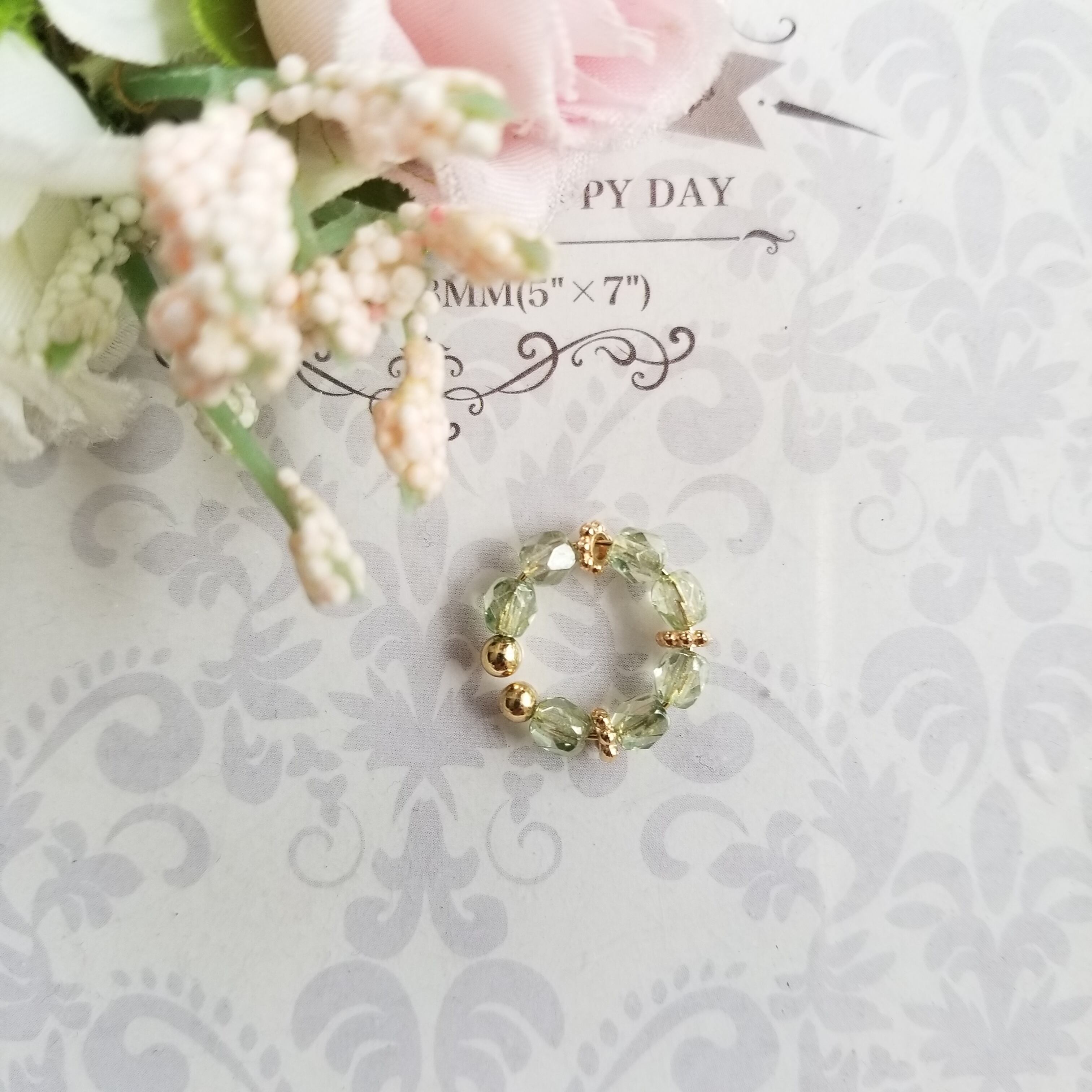 グリーンのオリーブラスターのチェコビーズがきらきら綺麗なイヤーカフです。