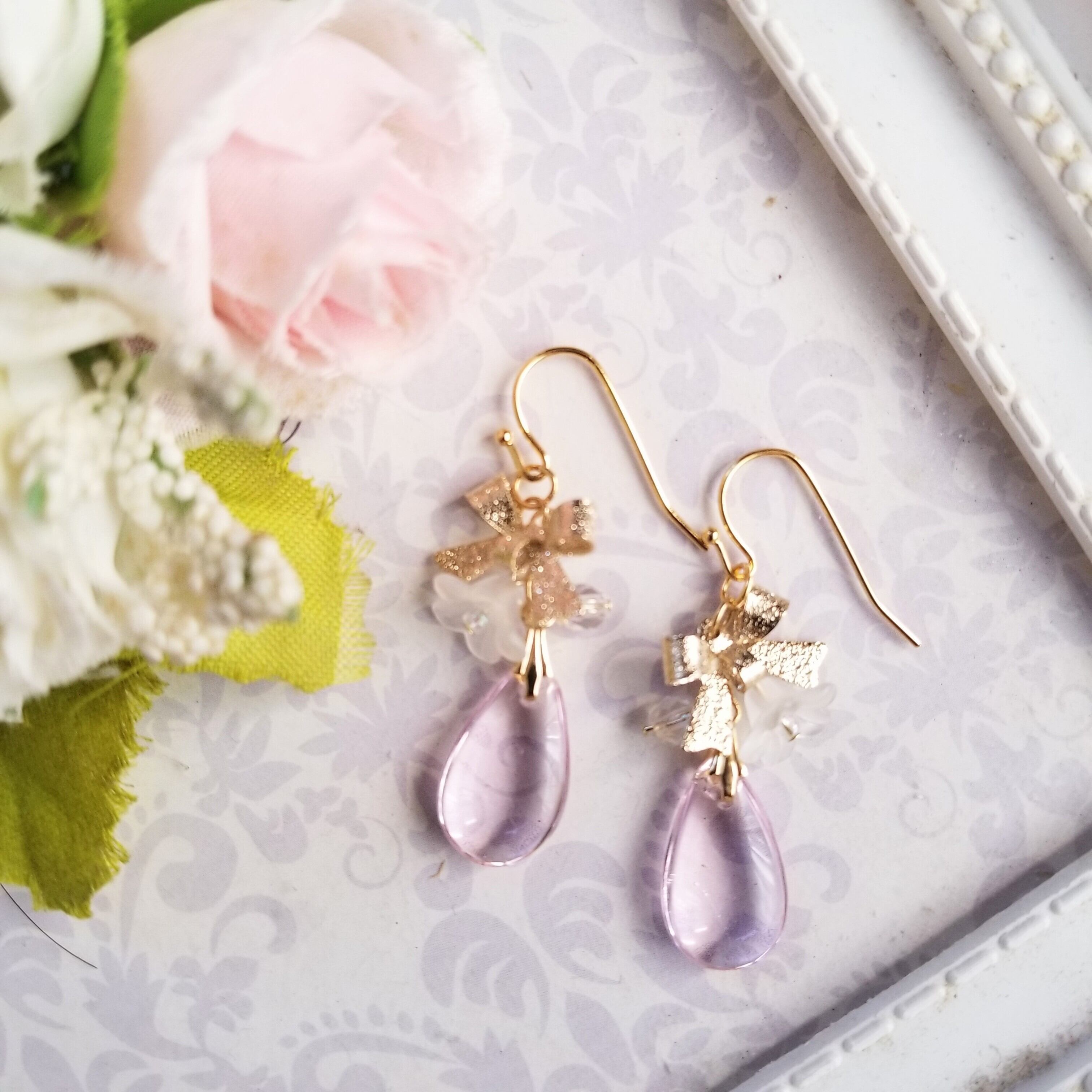 透明感が綺麗なチェコティアドロップとリボンのピアス又はイヤリング 結婚式、成人式、卒業式、入学式