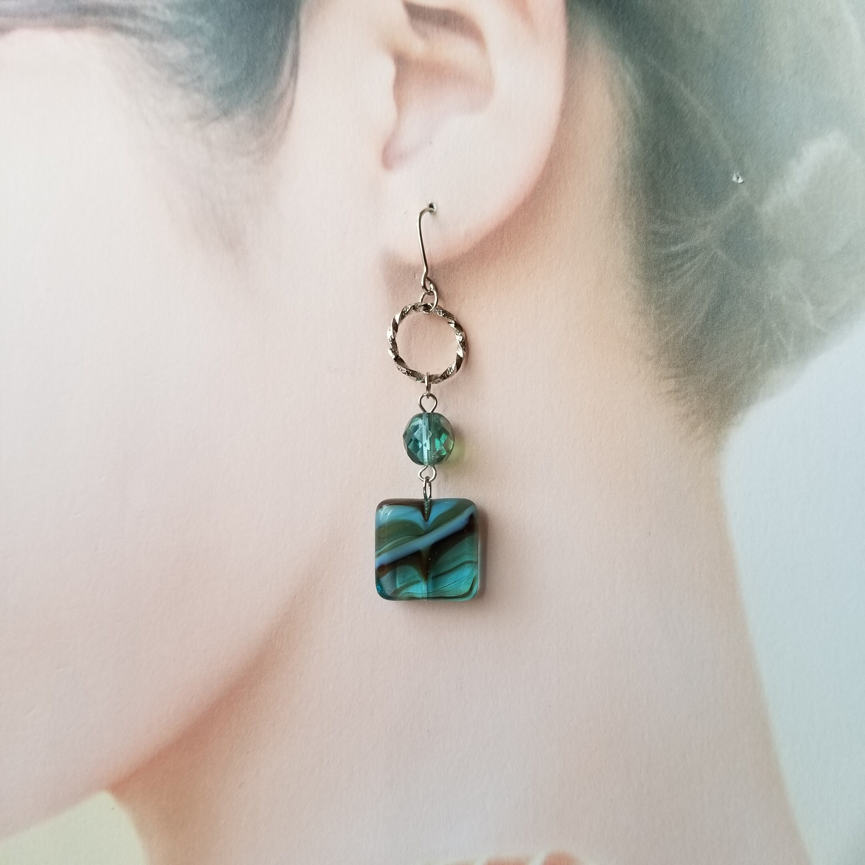 ブルーに茶色の模様が入り交じった四角いチェコビーズと、透明感がとても美しいデザインです。
