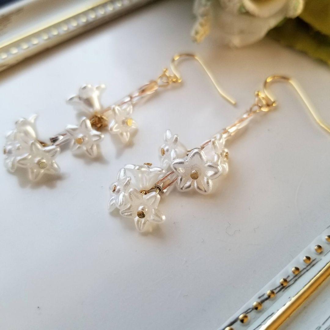 細長い竹ビーズを使い、その先には白い小さなお花が三つ繋がっています。