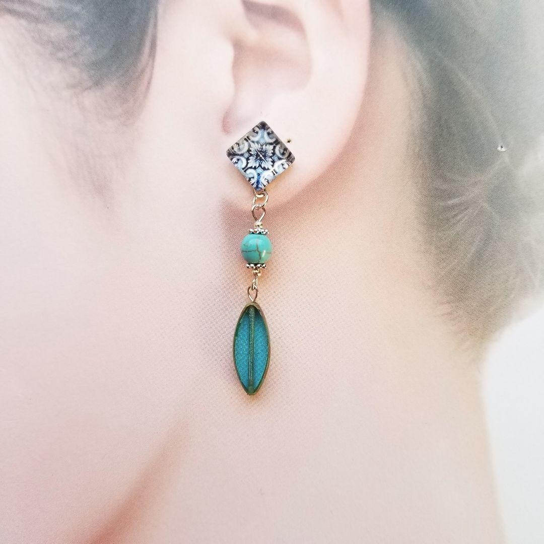 エキゾチックな魅力を放つモロッコ柄のタイルに、清涼感あふれるターコイズと繊細なチェコビーズを調和させたピアスです。