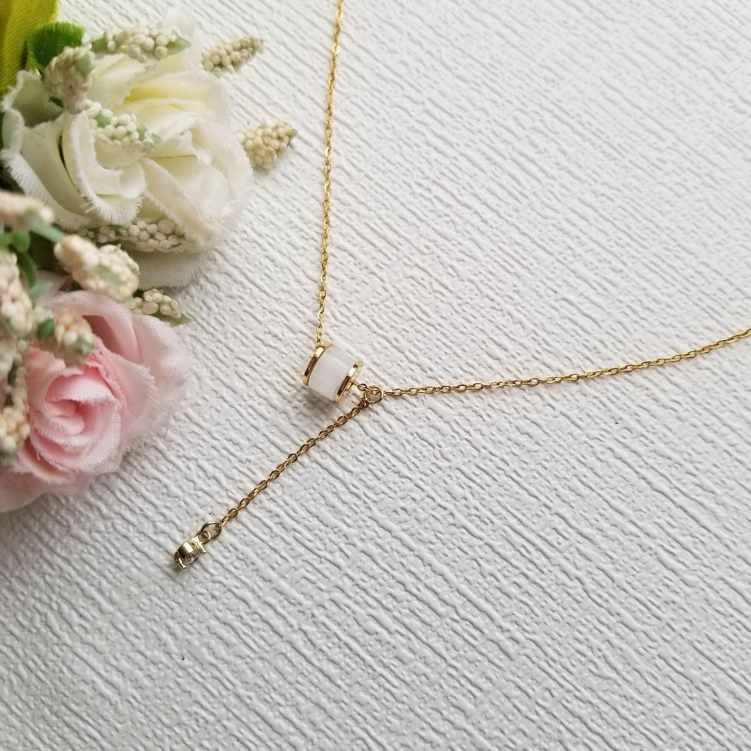 ゴールドカラーのチェーンに美しいモチーフをあしらい、横からチェーンを垂らしてビジューを引き立てています。