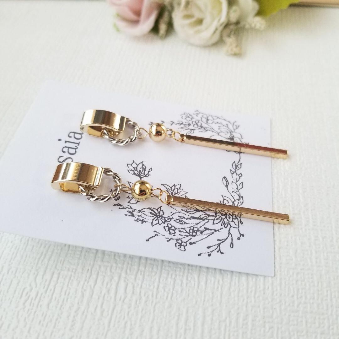 異なるカラーの金属パーツを組み合わせたデザインが耳元に個性的で洗練された印象を与えます。